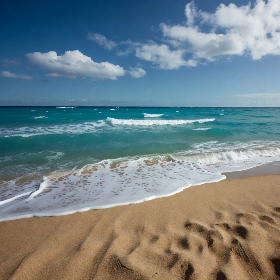 beach scene, blue sky, clear sky, coast, crashing waves, foam, footprints, nature, ocean, sand, sandy shore, sea, seascape, shoreline, sunny day, tropical beach, turquoise water, waves, white clouds, beach
