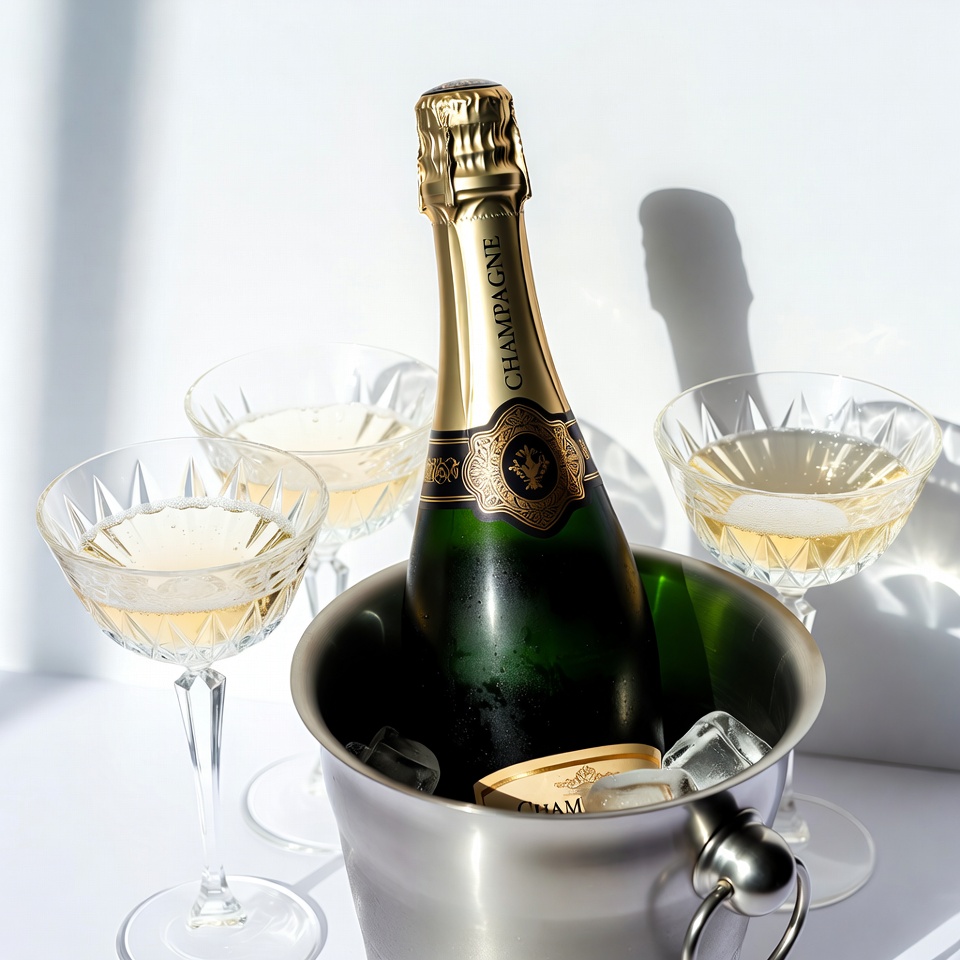 A green bottle of champagne sits in a silver ice bucket filled with ice. Four crystal glasses filled with champagne surround the bucket. Sunlight casts shadows on the white background.
