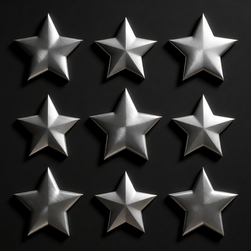 Nine shiny silver stars with a metallic finish are arranged in a three-by-three grid. They are positioned against a solid black background, creating a high-contrast 3D effect. Each star features reflective surfaces and sharp edges.