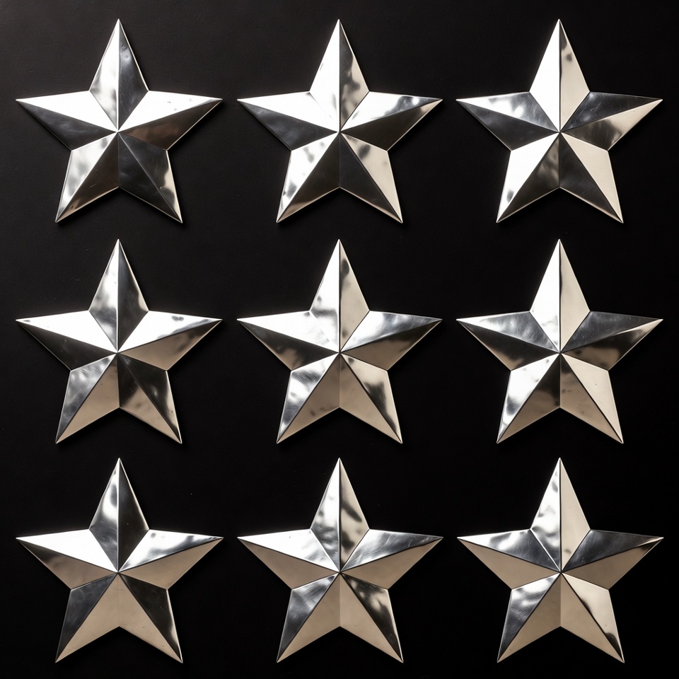 Nine metallic silver five-pointed stars are arranged in a three-by-three grid. Each star has a reflective, polished surface with highlights and shadows. They are isolated against a solid black background.