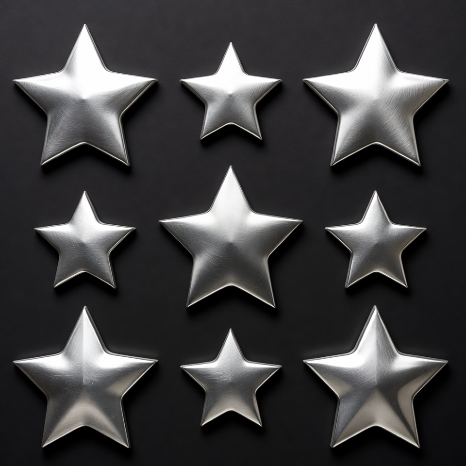 3D stars, black background, grid arrangement, isolated stars, metallic stars, nine stars, reflective stars, shiny stars, silver metallic, star icons, star shape, stars, silver stars