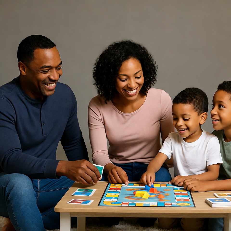 A smiling African-American family sits on the floor playing Monopoly. The father in a blue shirt and mother in a pink top lean over the colorful board with their three young sons, who wear white and green shirts. They hold game cards and pieces on a light wooden table against a gray background.