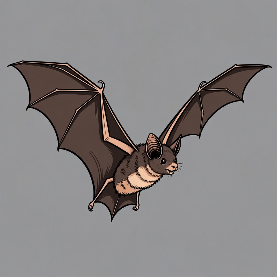 A detailed cartoon bat with brown wings spread wide is flying against a gray background. It features a furry body, large ears, and a pinkish snout. The illustration has bold outlines and vibrant shading.