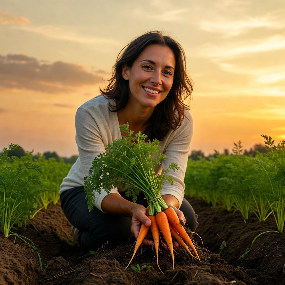 A smiling woman with long brown hair kneels in a carrot field at sunset, holding a bunch of freshly harvested orange carrots. She wears a light beige sweater and dark pants, surrounded by green carrot tops and soil. The sky glows with orange hues behind the vast field.
