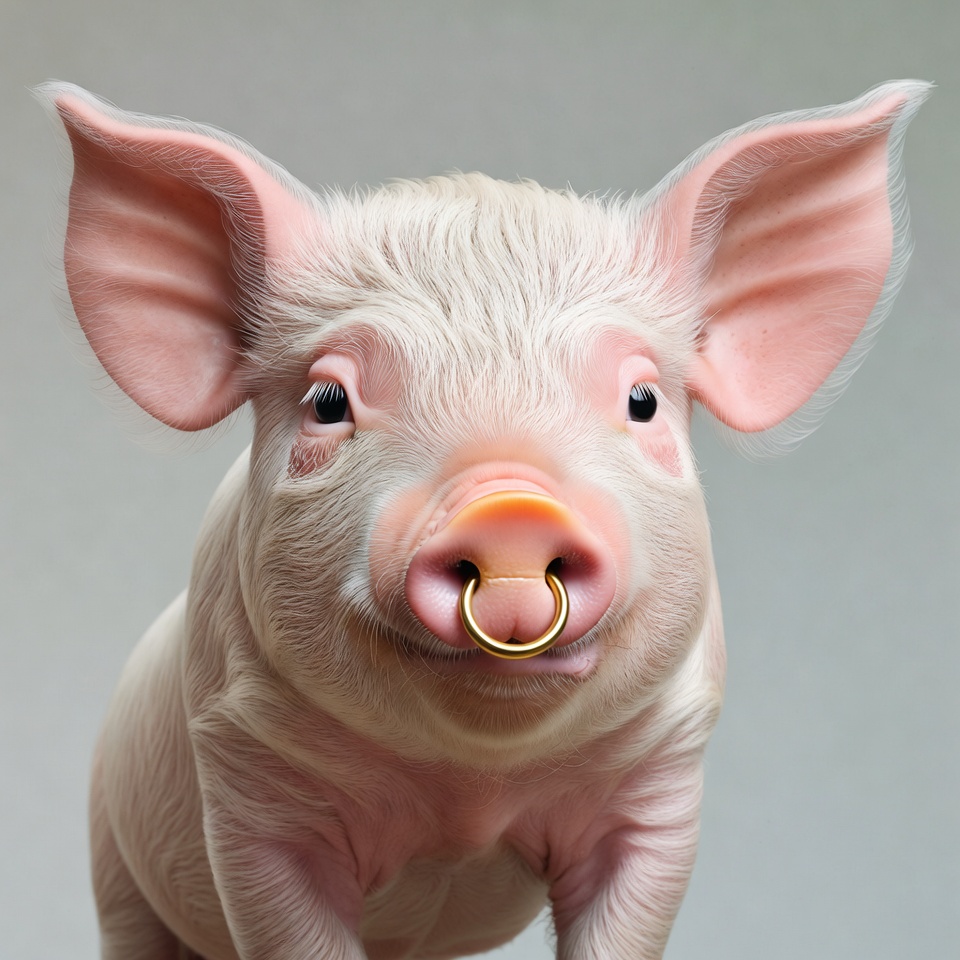 adorable pig, animal, baby pig, cute pig, farm animal, floppy ears, gold piercing, gray background, illustration, nose piercing, pig nose ring, piglet, pink pig, snout, pig
