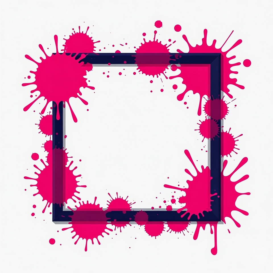abstract frame, black frame, clipart, design element, frame, graphic, illustration, isolated background, magenta splatter, paint drops, paint splatter, pink drops, pink paint, splash, splash effect, square frame, vector art, pink splatter