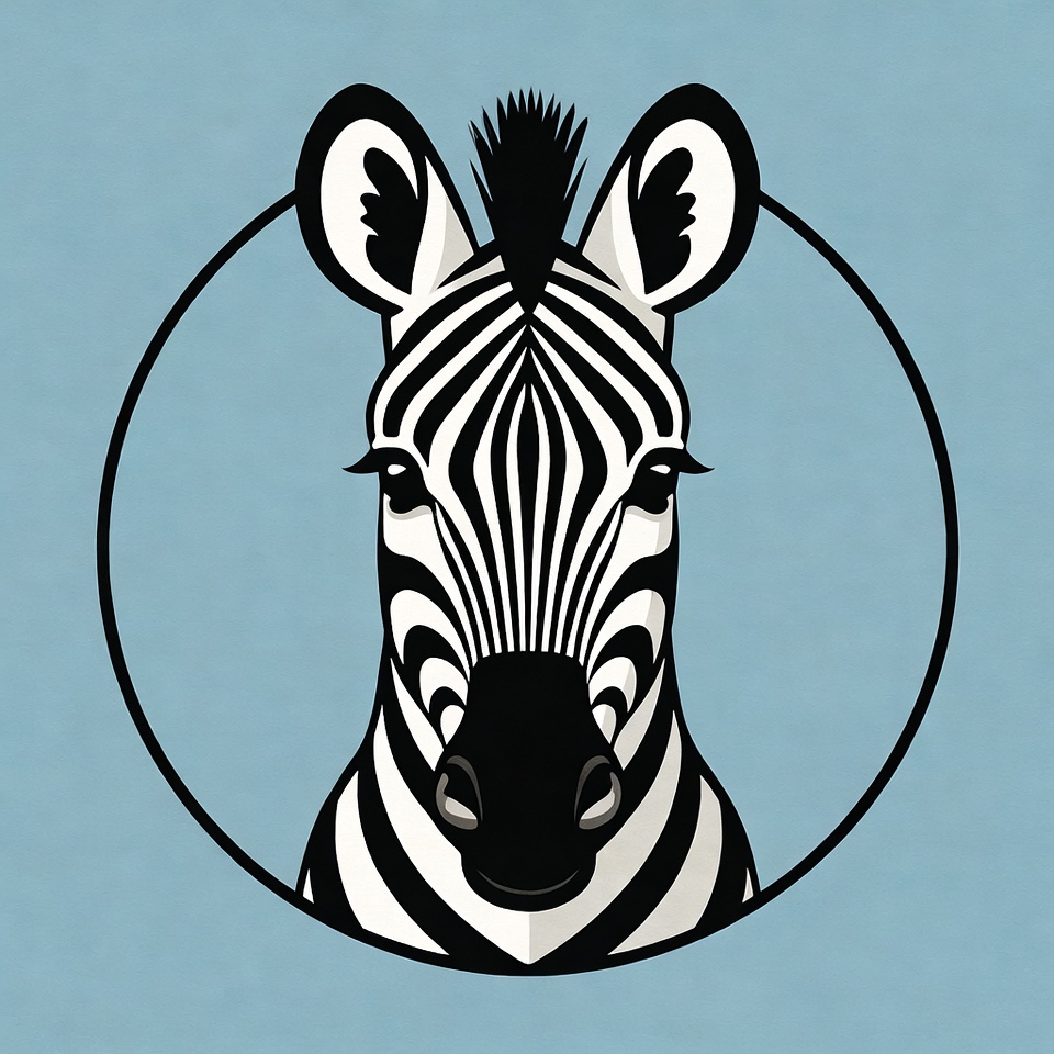 A black and white zebra head with distinctive stripes faces forward inside a simple circular outline. The illustration features bold outlines and a fluffy mane on a solid light blue background. The design is clean and vector-style with no additional elements.