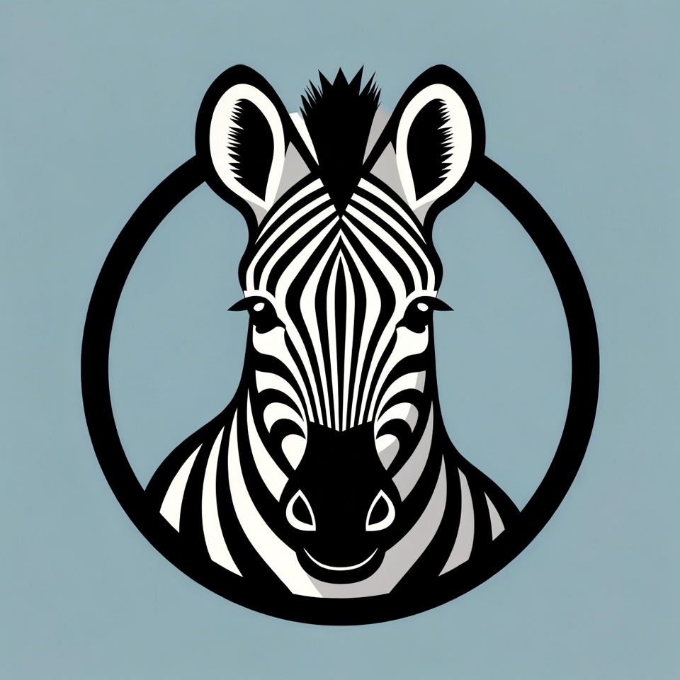 A stylized black and white zebra head illustration faces forward with a smiling expression. It features bold stripes and pointed ears inside a thick black circular outline. The design is set against a light blue background.