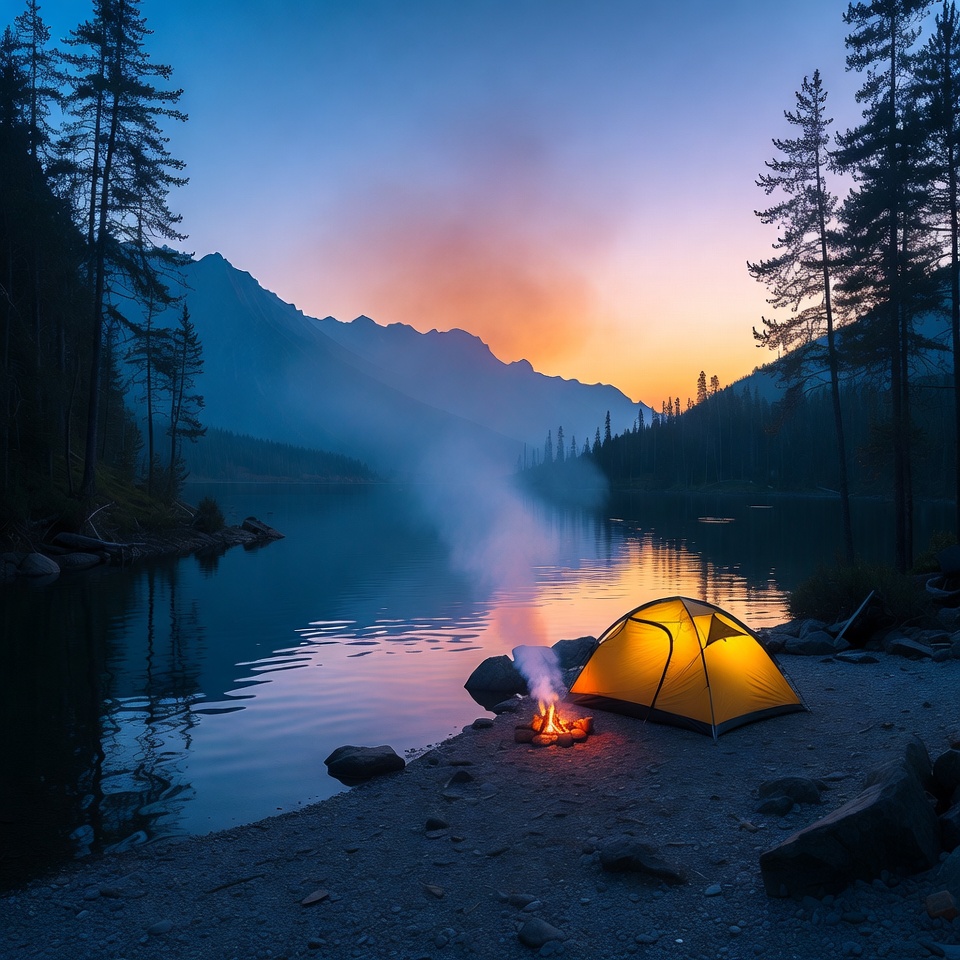 A yellow tent is pitched on the rocky shore of a calm lake surrounded by dense pine trees and majestic mountains. A campfire burns brightly in front of the tent, with smoke rising into the twilight sky. The scene reflects beautifully in the still water during a colorful sunset.