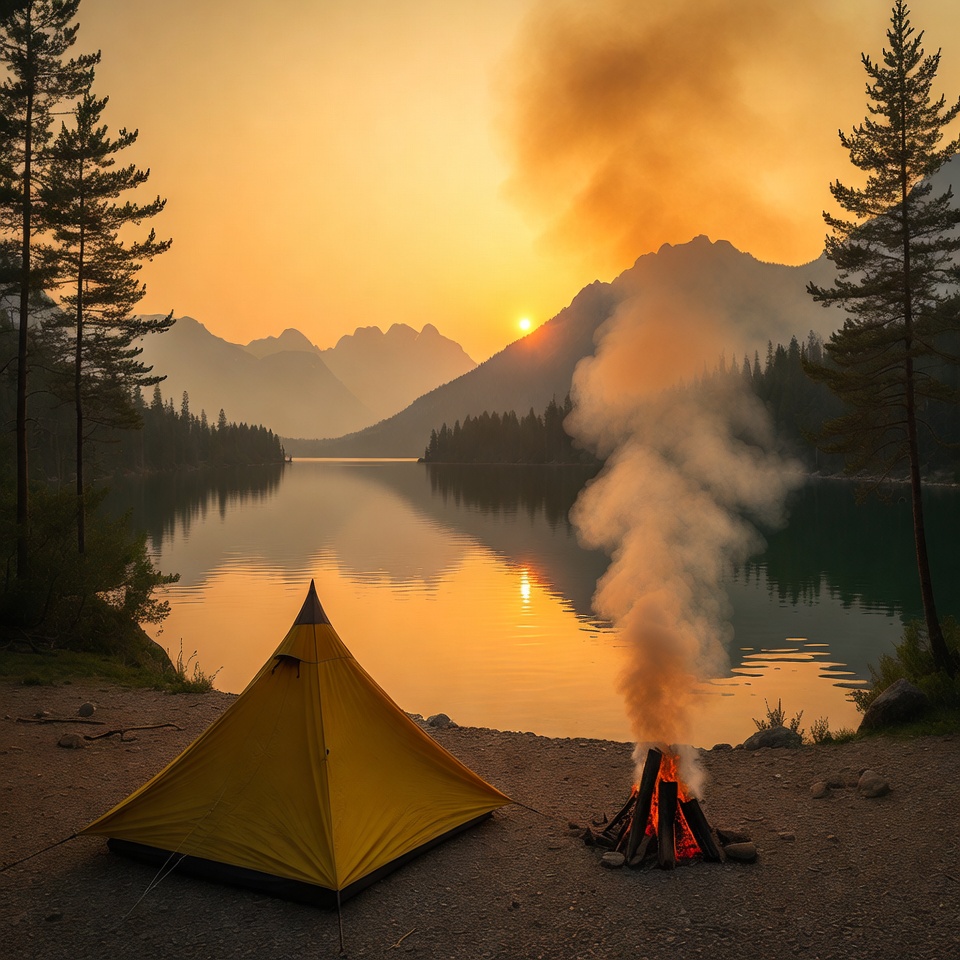 A yellow tent is pitched on the shore of a calm lake with mountains in the background during sunset. A campfire burns brightly next to the tent, with smoke rising into the colorful orange and pink sky. Pine trees frame the scene, and the lake reflects the surrounding landscape.
