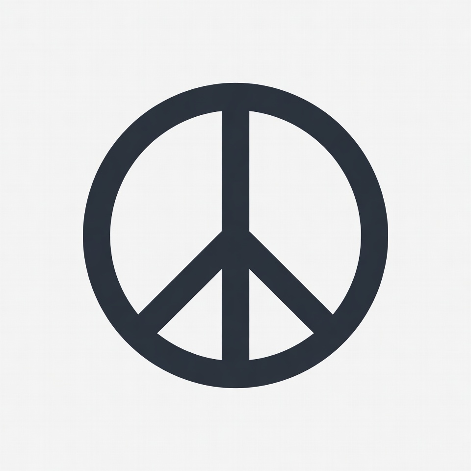 A simple black peace symbol icon features a circle enclosing a forked design with vertical and diagonal lines. It is rendered in a clean, minimalist style on a transparent background. The icon is bold and symmetrical.