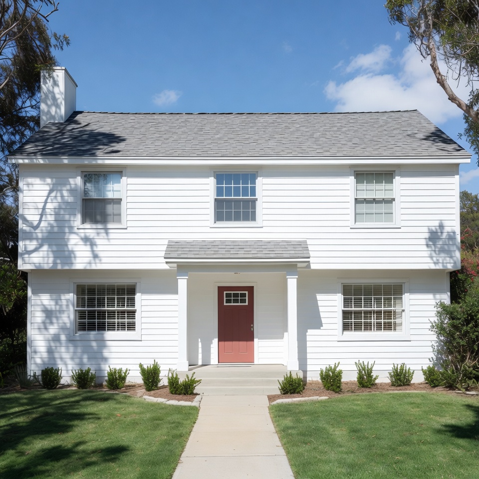 architecture, blue sky, chimney, clapboard siding, clear sky, exterior, front porch, gray roof, green lawn, house front, manicured yard, red door, residential home, shrubs, suburban house, trees, two-story house, walkway, windows, white house