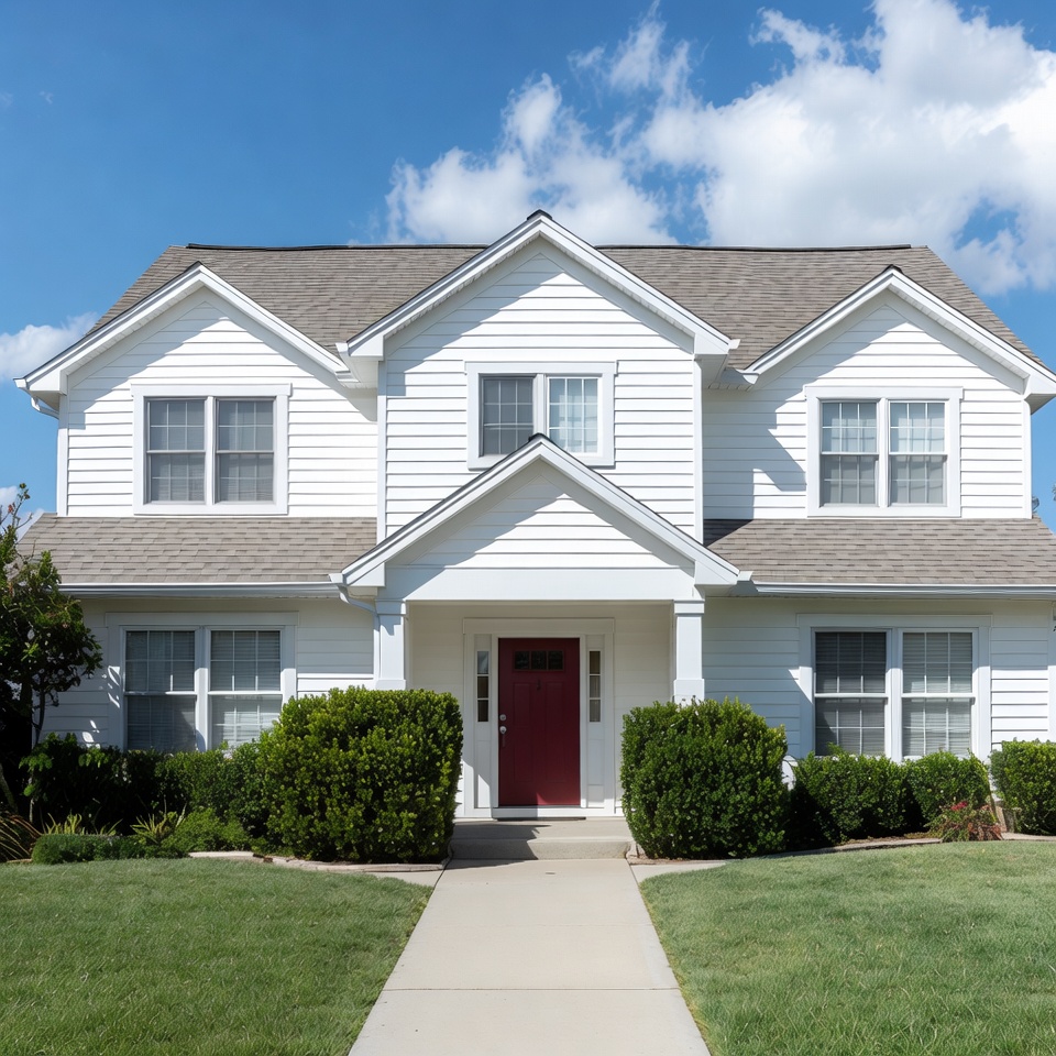 A large two-story white house features a gabled roof with gray shingles and multiple windows. A prominent red front door is centered under a white porch, flanked by manicured bushes. The house sits on a green lawn with a concrete walkway leading to the entrance under a clear blue sky.