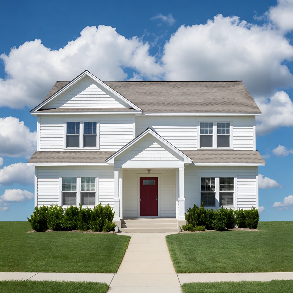 blue sky, bushes, front door, gray roof, green lawn, home exterior, porch, red door, residential house, suburban home, two-story house, walkway, white clouds, white house, windows, house