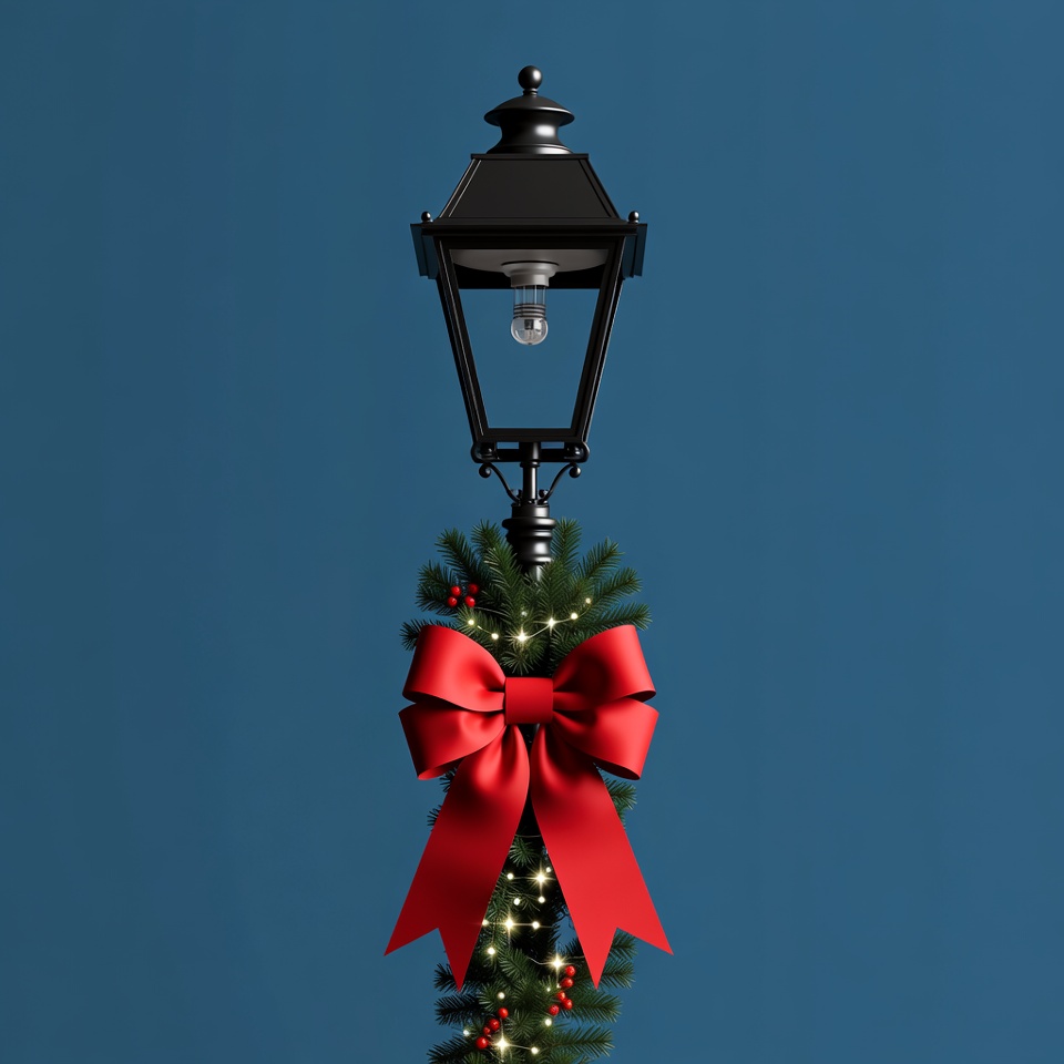 A black vintage street lamp stands against a solid blue background. It is decorated with green fir branches, twinkling lights, and a large red satin bow tied around the base. A lit bulb glows inside the glass enclosure at the top.