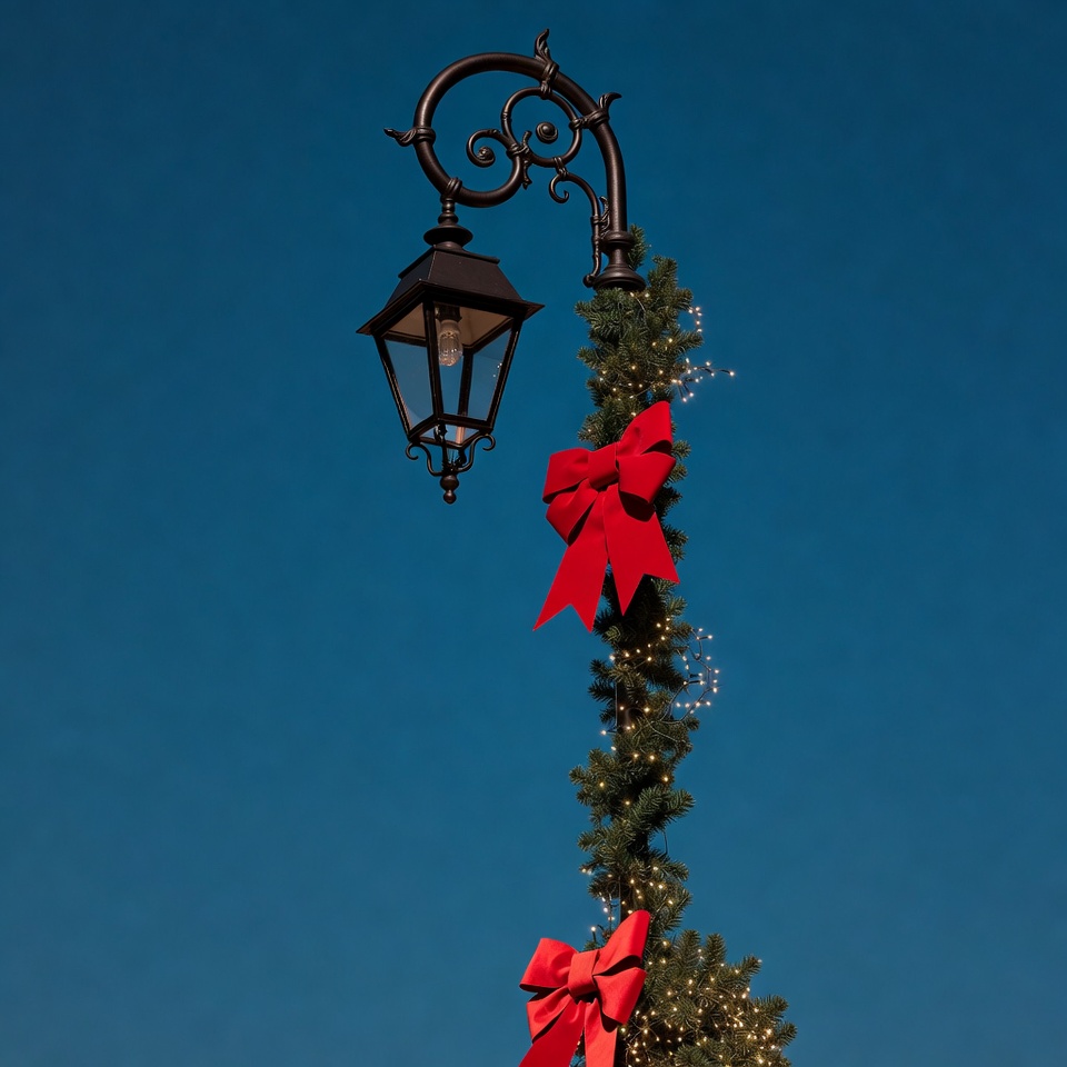 Christmas decoration, Christmas lantern, black pole, blue sky, evergreen garland, fairy lights, festive pole, garland wrap, holiday decor, outdoor lighting, red bows, satin ribbons, street lamp, vintage lamp, wrought iron, lantern