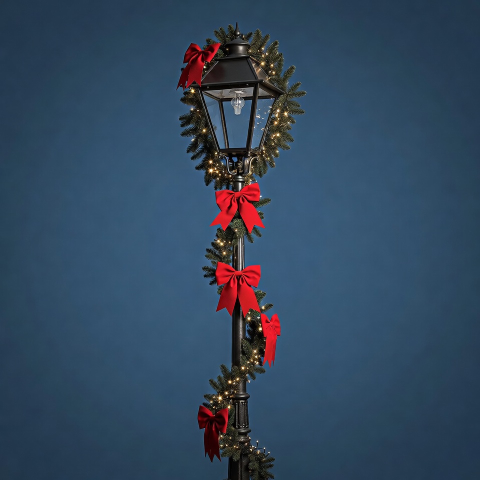 A black metal street lamp stands on a solid blue background, adorned with green garland wrapped around its pole and top. Large red satin bows are tied at intervals along the garland. The lamp's glass enclosure glows with warm light.