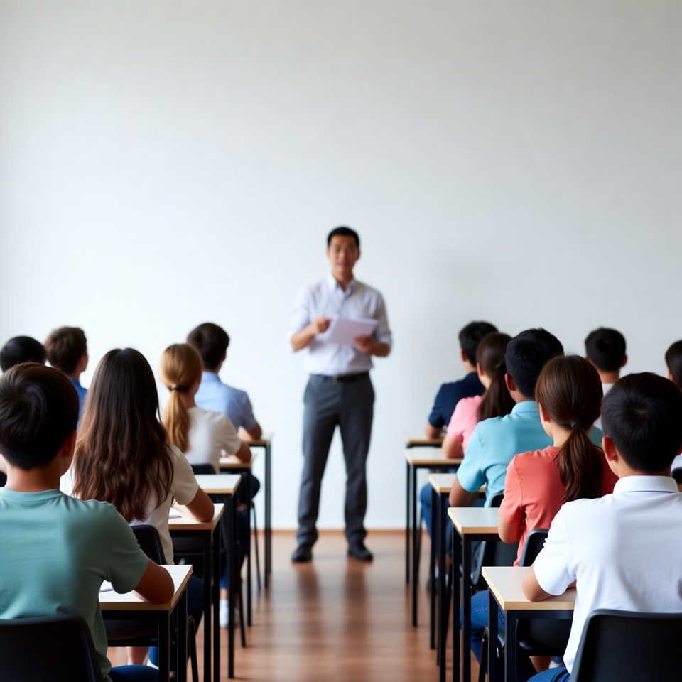 An Asian male teacher stands at the front of a classroom holding papers and gesturing while lecturing. Rows of Asian students, both male and female, sit attentively at desks facing him. The room features white walls and wooden flooring with desks arranged in neat rows.