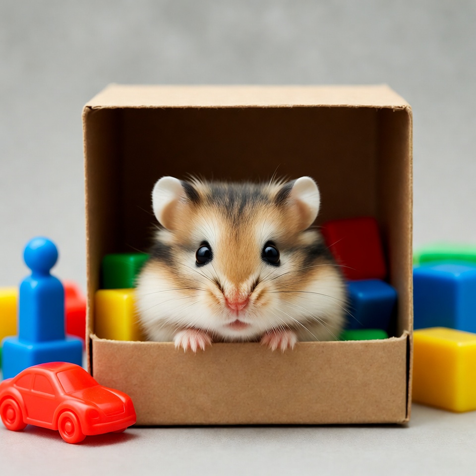 A cute hamster with light and dark fur sits inside an open cardboard box surrounded by colorful building blocks and toy cars. The hamster peeks out with its paws on the box edge, looking directly at the camera. The toys include red toy cars and blue and yellow blocks scattered around the box on a gray background.