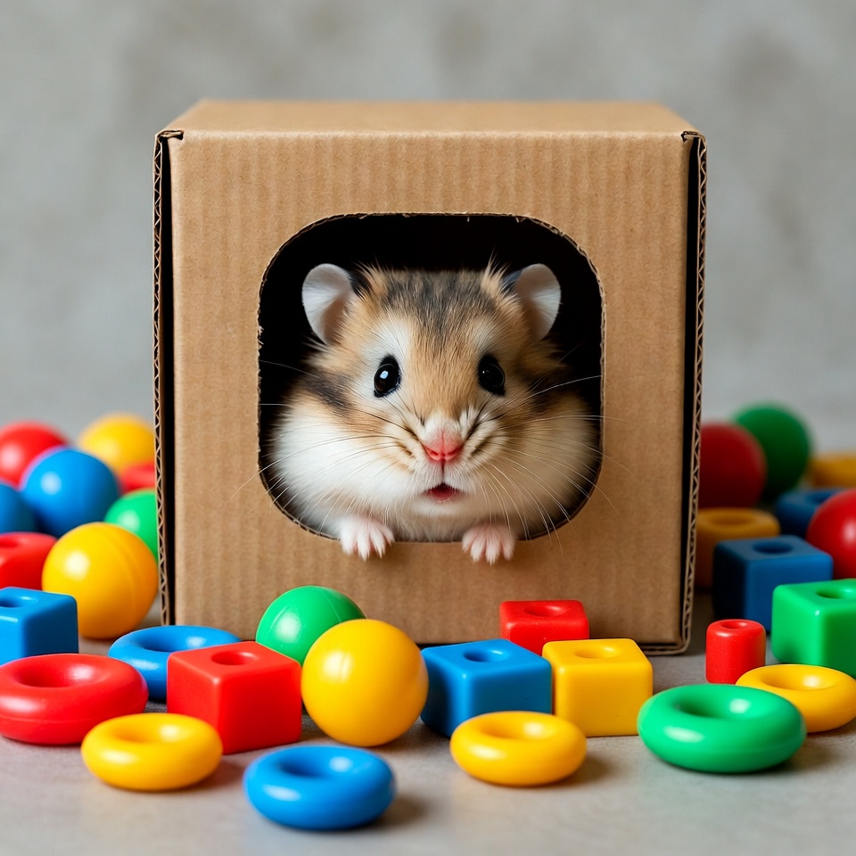 A cute hamster with brown and white fur peeks out from a square cutout in a brown cardboard box. Its paws rest on the edge of the opening, and it looks forward with bright eyes. Colorful plastic toys including red, blue, yellow, and green balls and blocks are scattered around the box on a gray background.