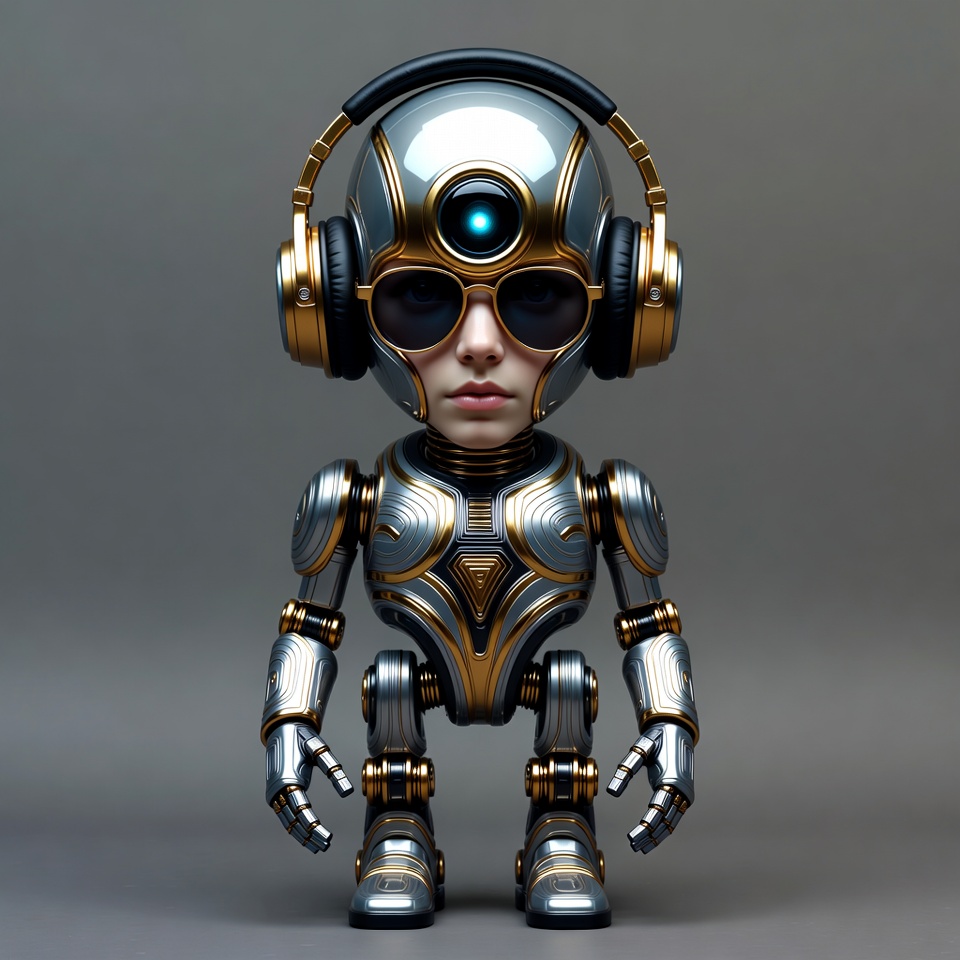 A small silver humanoid robot stands on a gray background, wearing shiny black headphones and mirrored sunglasses. It has a feminine face with glossy metallic features, a glowing blue eye on its forehead, and intricate gold accents on its armored body. The robot poses confidently with articulated joints and sturdy feet.