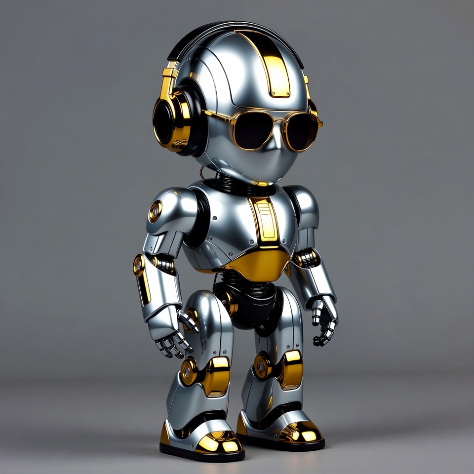 A cute chibi-style robot stands on a gray background. It has a shiny silver body with gold accents, black legs, and wears large gold headphones and reflective sunglasses. The robot features a smooth face and mechanical joints.