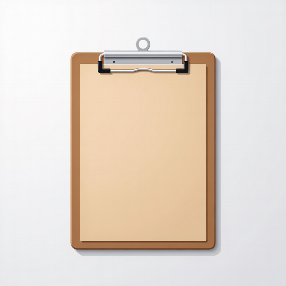 A simple illustration of a tan clipboard with a silver clip holding blank beige paper. The clipboard hangs from a metal ring and is centered against a white background. It features clean vector graphics with subtle shadows.
