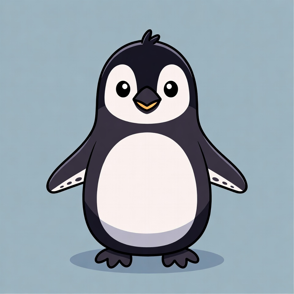 A cute cartoon penguin with black and white feathers stands on a light blue background. It has large expressive eyes, a yellow beak, and flippers outstretched. The illustration features a chubby body and simple, bold outlines.