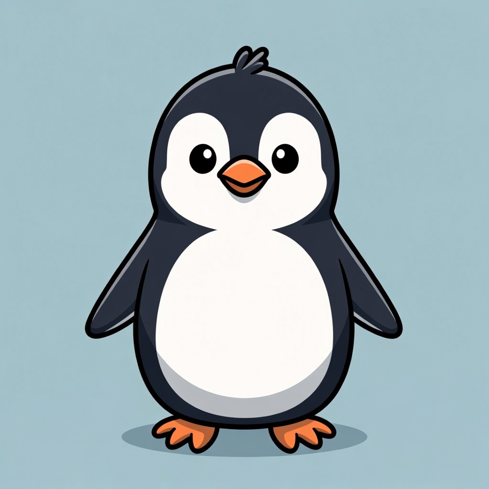A cute cartoon penguin with black and white feathers stands on a light blue background. It has large expressive eyes, a small orange beak, and orange feet. The illustration features a chubby body and simple, playful lines.