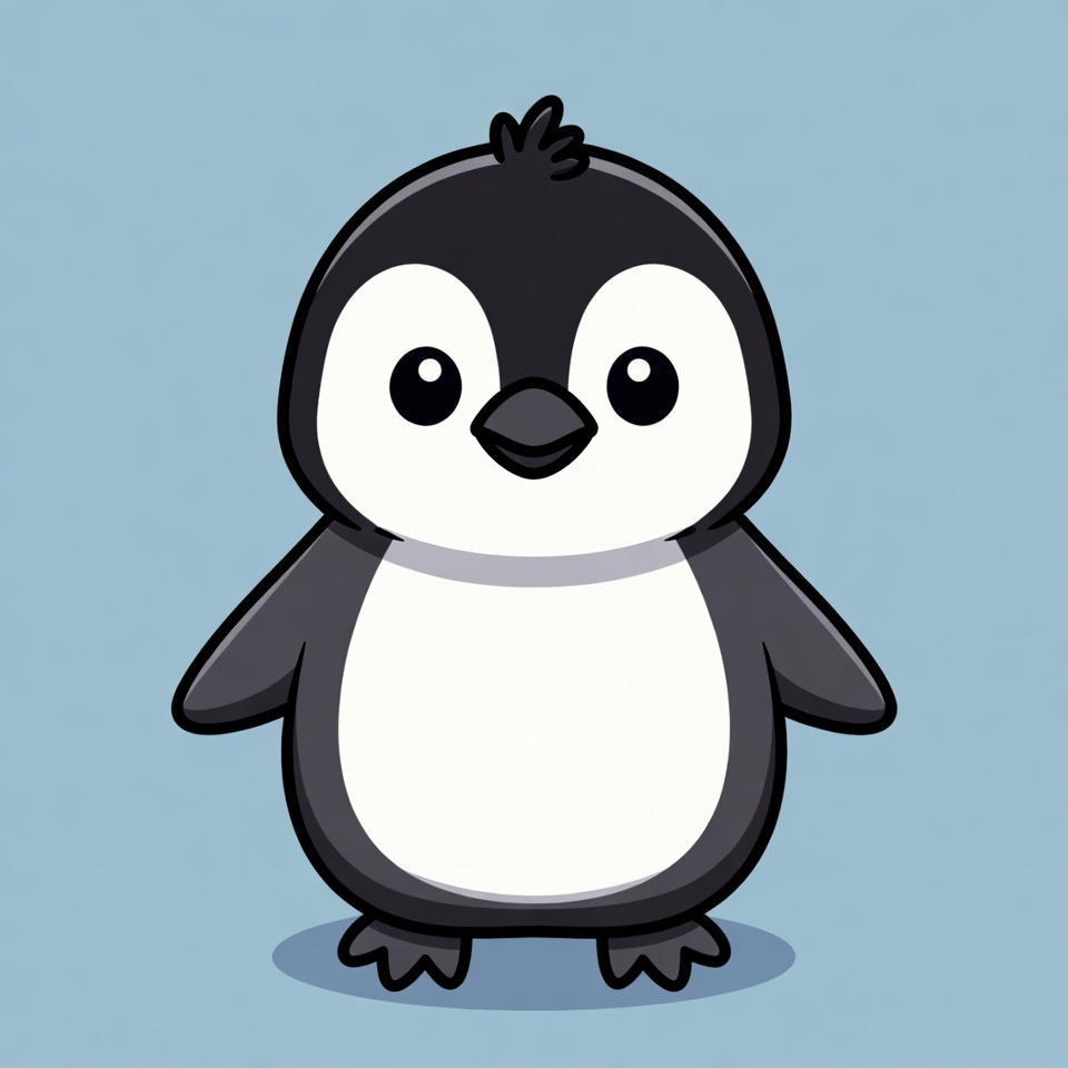 A cute cartoon baby penguin stands on a light blue background. It has black feathers, a white belly, large sparkling eyes, and fluffy tufts on its head. The illustration features simple bold lines and a friendly expression.