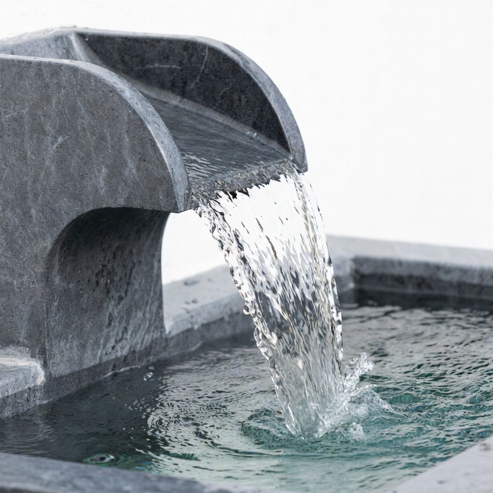 cascading water, decorative fountain, flowing water, fountain spout, garden fountain, gray stone, isolated background, modern design, ripples, splash, stone fountain, water feature, water pool, white background, water fountain