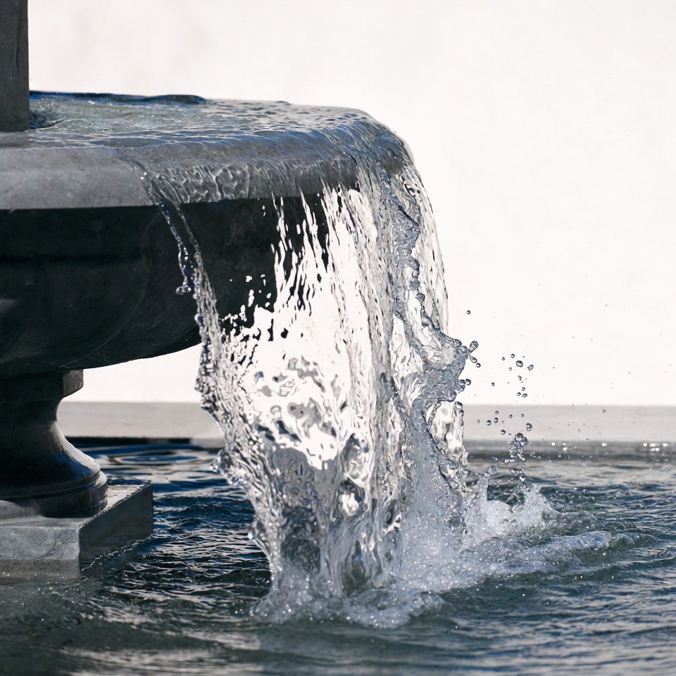 A stone fountain with gray edges features clear water cascading over the rim into a pool below. Water droplets splash dynamically against the white background. The focus is on the flowing water and stone structure.