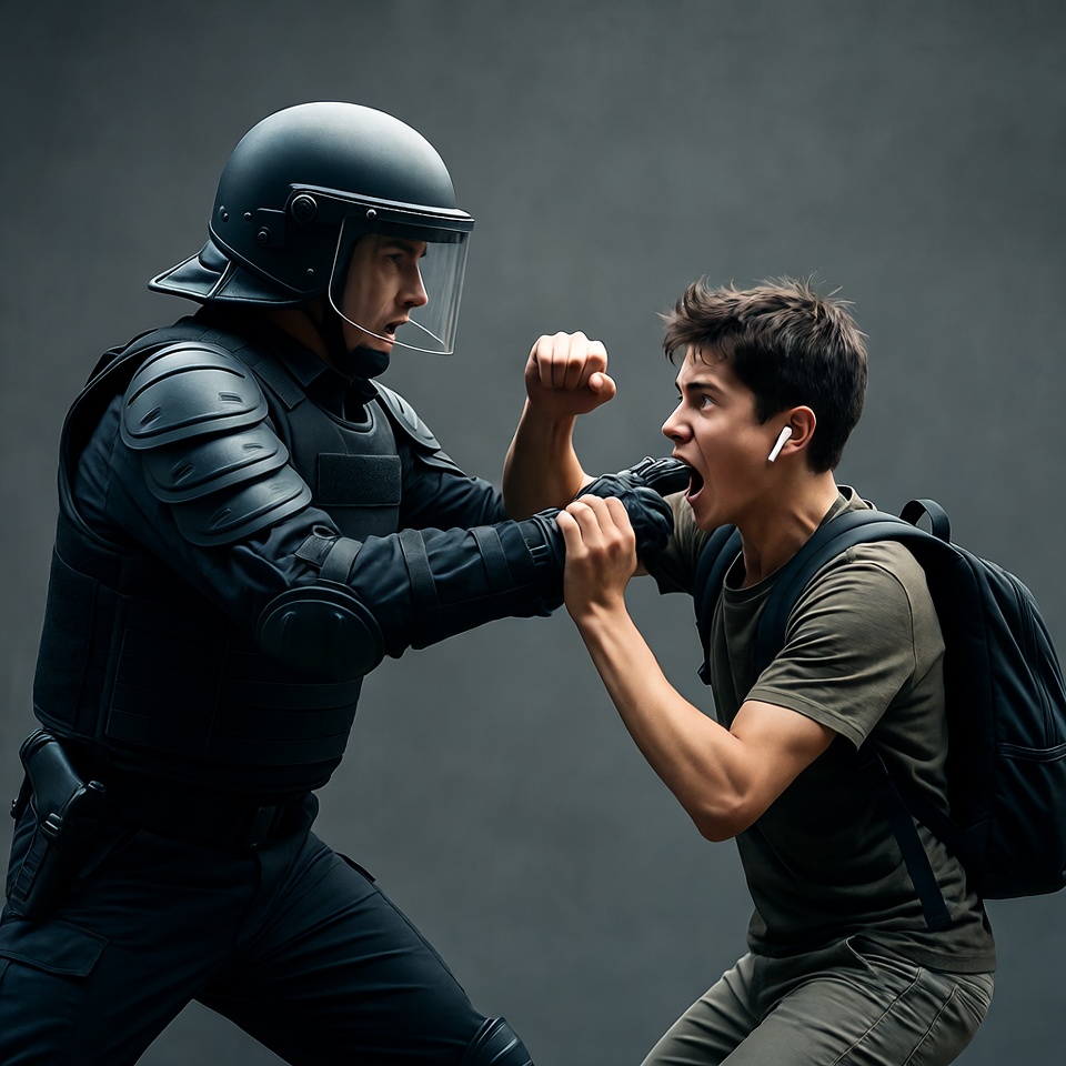 A riot police officer in full black gear and helmet grabs and restrains a young boy protester who is shouting with mouth open. The boy wears a green t-shirt, has curly brown hair, an AirPod in one ear, and carries a black backpack. Both face each other against a plain gray background.