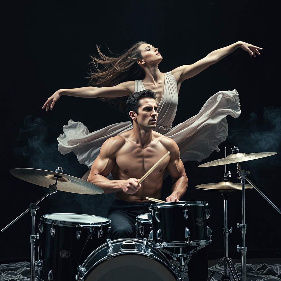 A muscular shirtless man plays drums energetically with drumsticks in hand, surrounded by cymbals and drums on a dark smoky background. A woman in a flowing white dress performs a ballet pose above him, with long hair flying and arms extended gracefully. Smoke swirls around the drum set and her dress.