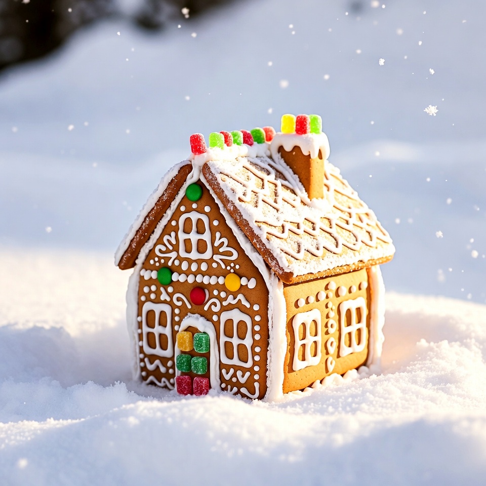 A small gingerbread house covered in white icing and colorful candies sits on a snowy ground. It features gingerbread walls, a sloped iced roof with a chimney, and candy decorations on windows and doors. Snowflakes fall around the festive house against a snowy backdrop.