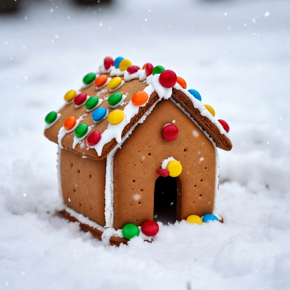 A small gingerbread house covered in white icing and colorful candies sits on a snowy ground. The house features a brown gingerbread structure with a sloped roof decorated with red, green, blue, and yellow M&M-style candies. Snowflakes fall around it, enhancing the winter scene.