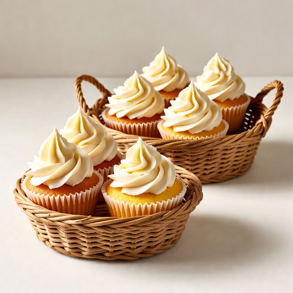 baked goods, bakery items, basket arrangement, close-up food, cream topping, dessert, edible, food photography, food styling, fresh cupcakes, frosting swirls, gourmet cupcakes, isolated background, pastry, sweet treats, vanilla cupcakes, white frosting, wicker baskets, yellow cake, cupcakes