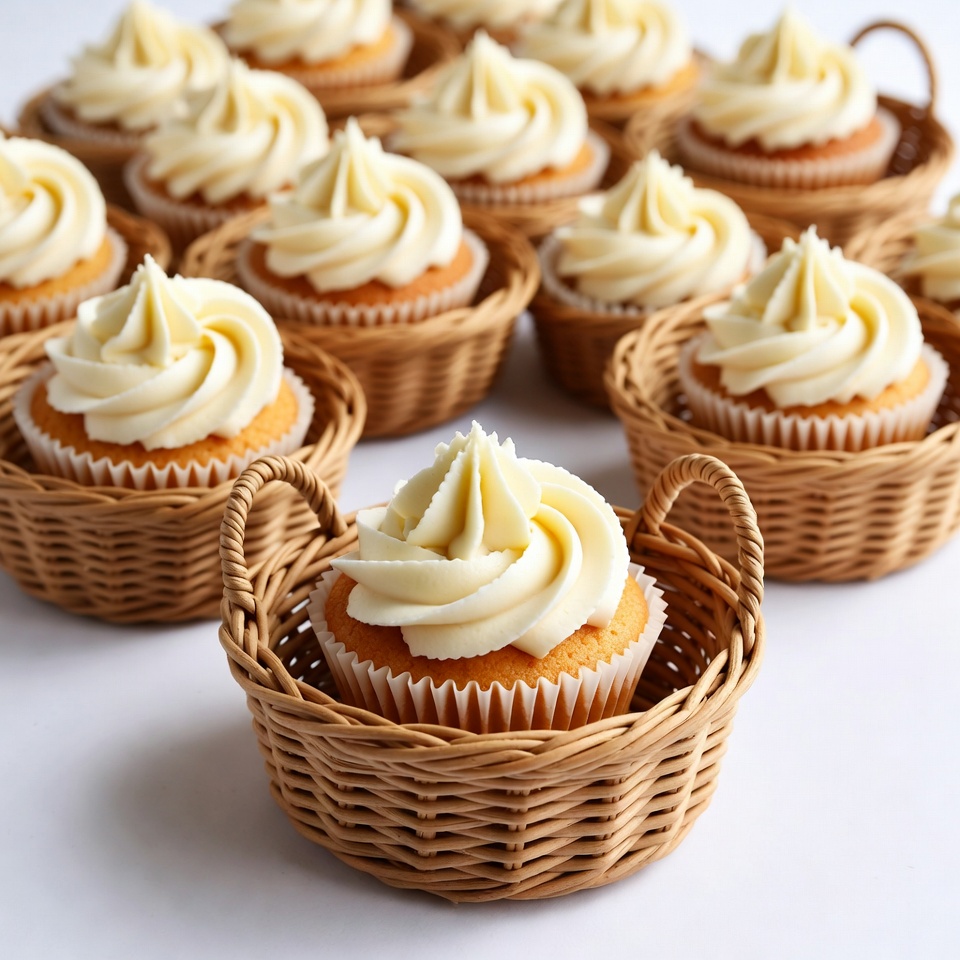 Multiple vanilla cupcakes topped with swirled white frosting sit inside small wicker baskets. The baskets are arranged on a white surface, showcasing the golden cupcake liners and creamy icing details. The composition highlights the fresh baked goods in a close-up view.
