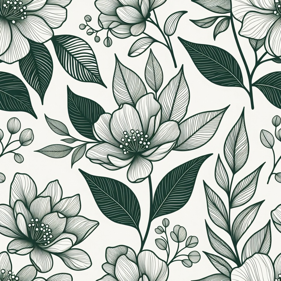 A seamless pattern illustration features large white flowers with green leaves and buds on a white background. The flowers have detailed line art petals and stems in shades of green. The design repeats continuously for use as wallpaper or fabric.