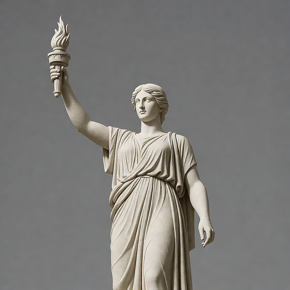 A classical white marble statue of a woman dressed in flowing ancient Greek robes holds a flaming torch aloft in her raised right hand. She stands in a dignified pose with her left hand at her side against a plain gray background. Her face features a serene expression with wavy hair.