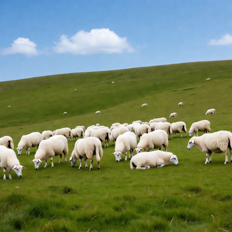 A large group of white sheep grazes on lush green grass covering a rolling hillside. Fluffy white clouds dot the clear blue sky above. Some sheep stand while others lie down amid the vibrant pasture.