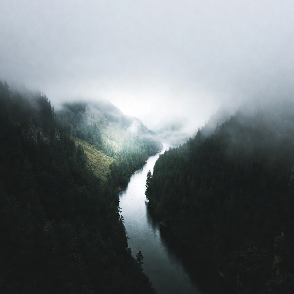 aerial view, atmospheric, canyon, clouds, conifers, environment, evergreen trees, fog, forest, green foliage, hiking, landscape, misty, mountains, nature, outdoors, peaceful, pines, remote, rocky slopes, scenery, serene, travel, valley, waterway, wilderness, river