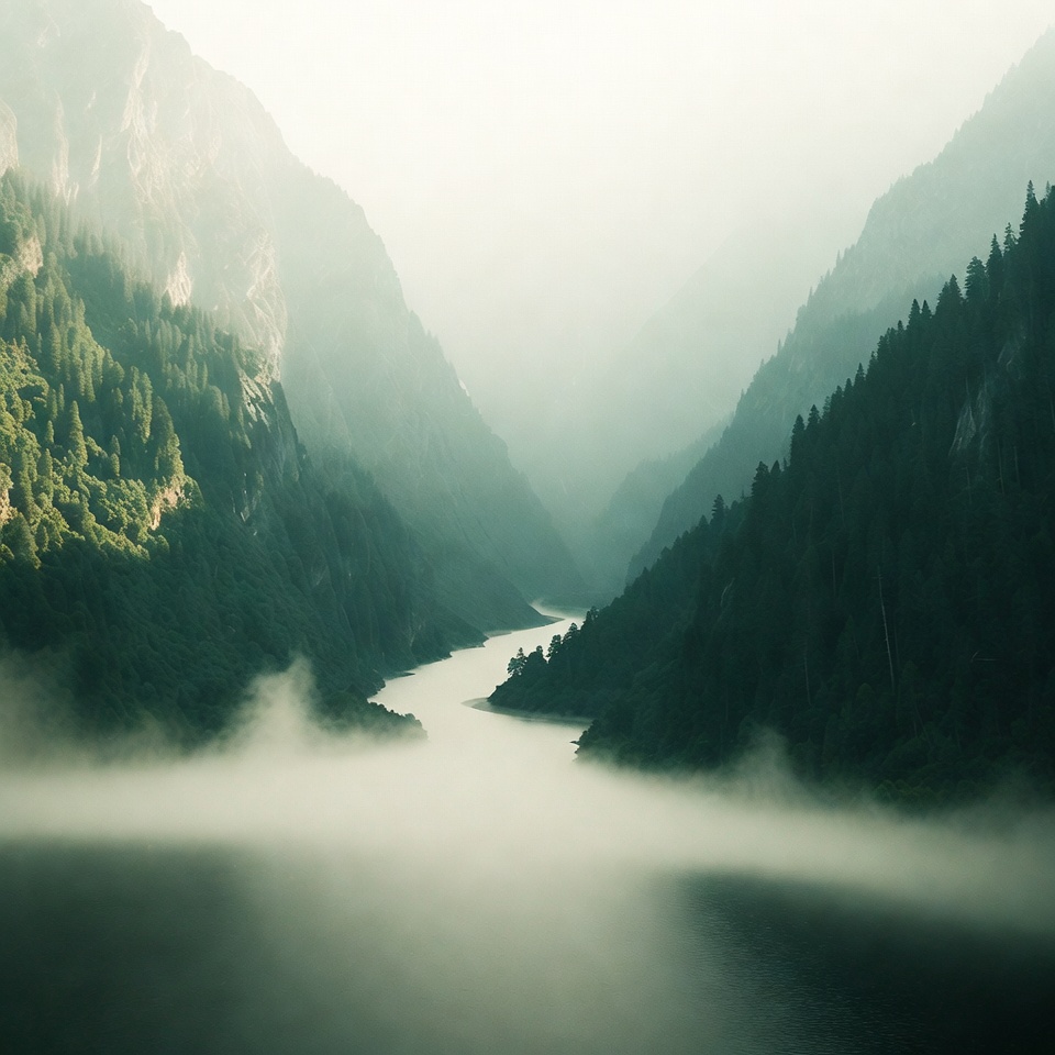 A winding river flows through a deep valley surrounded by steep, forested mountains. Thick mist envelops the scene, creating a serene and ethereal atmosphere. Dense green trees cover the rocky slopes on both sides.