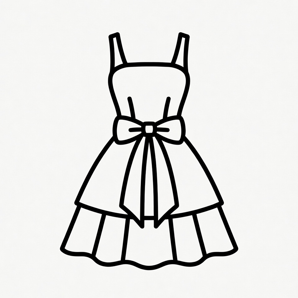 apparel, black lines, bow, clipart, clothing, cute dress, fashion, flared skirt, girly dress, graphic, icon, illustration, isolated, line art, outline, ruffles, simple drawing, sleeveless dress, vector, white background, dress