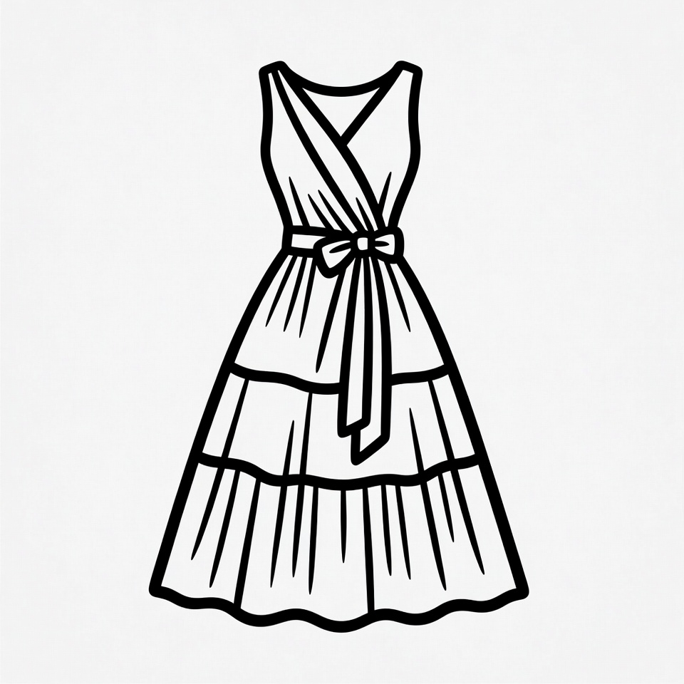 V-neck, apparel, black and white, clipart, clothing, fashion, illustration, isolated background, line art, midi dress, ruffled skirt, sleeveless dress, tie waist, tiered dress, women's dress, wrap dress, dress