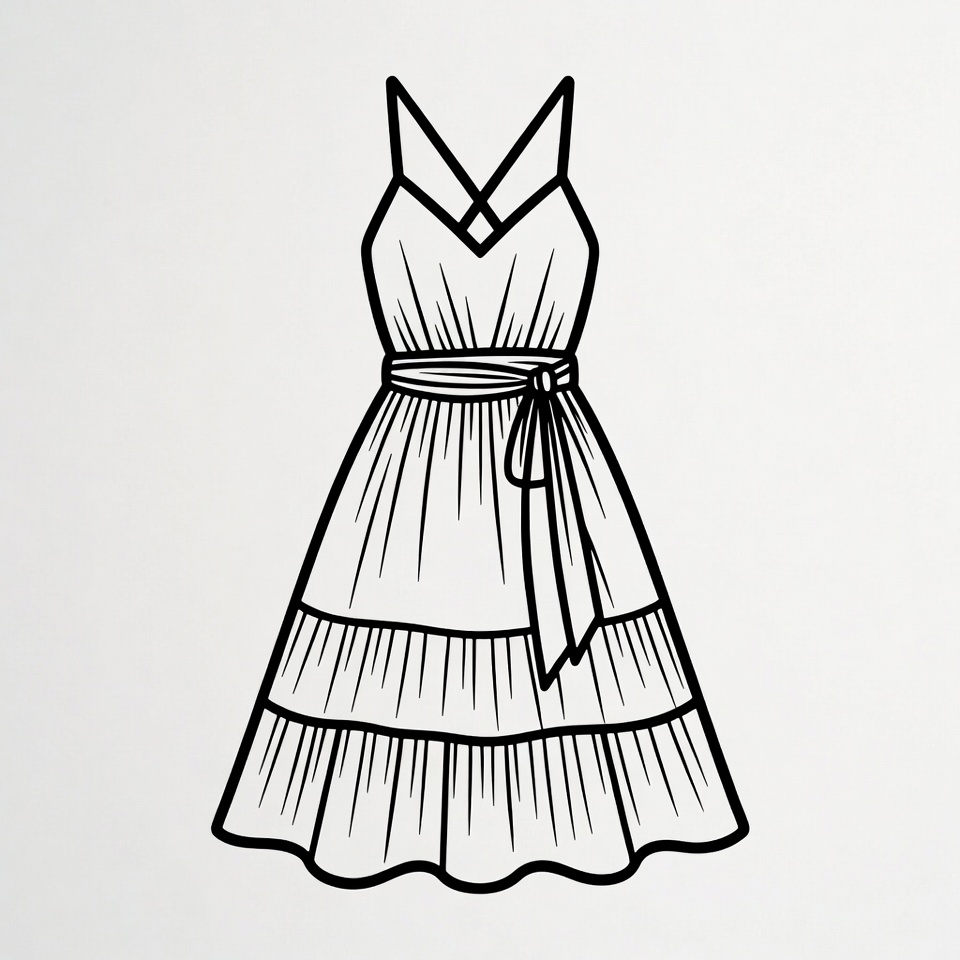 belt, black outline, clipart, drawing, fashion, graphic, illustration, isolated background, line art, ruffled skirt, sleeveless dress, spaghetti strap dress, summer dress, tiered dress, vector, womens dress, dress