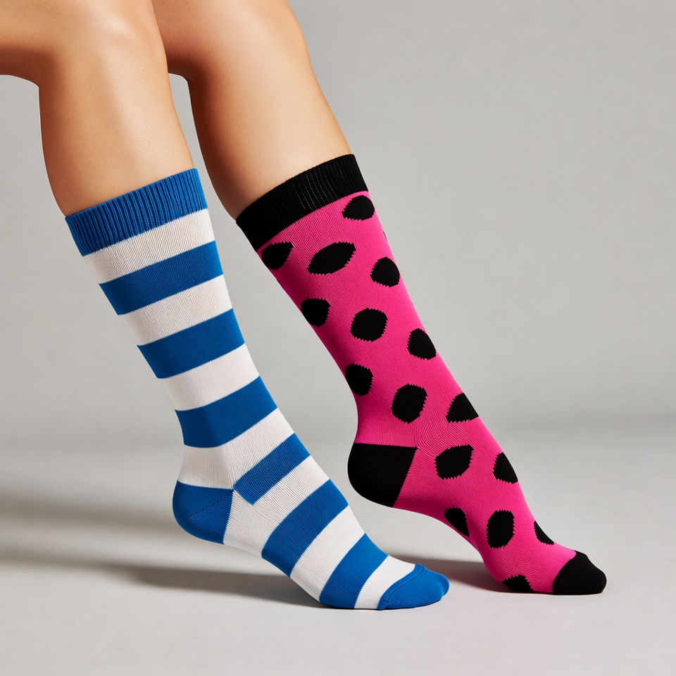 A woman's toned legs are crossed and displayed against a white background. She wears one blue and white striped sock and one pink sock with black polka dots and black trim. The socks are knee-high and prominently featured.
