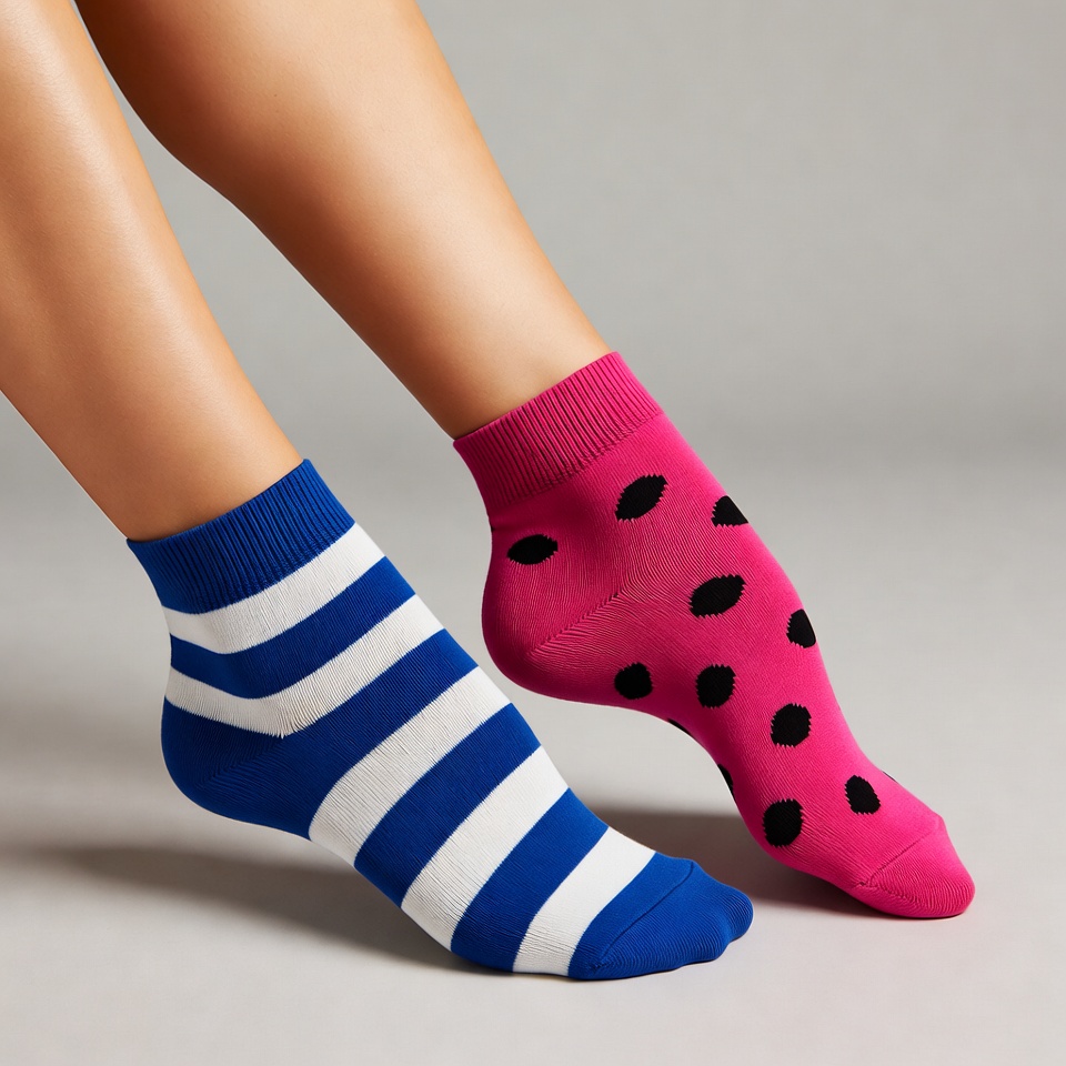 A woman's bare legs are crossed, showcasing one foot in blue and white striped socks and the other in pink socks with black polka dots. The image is isolated on a plain gray background, highlighting the colorful socks. The legs are toned and positioned dynamically.