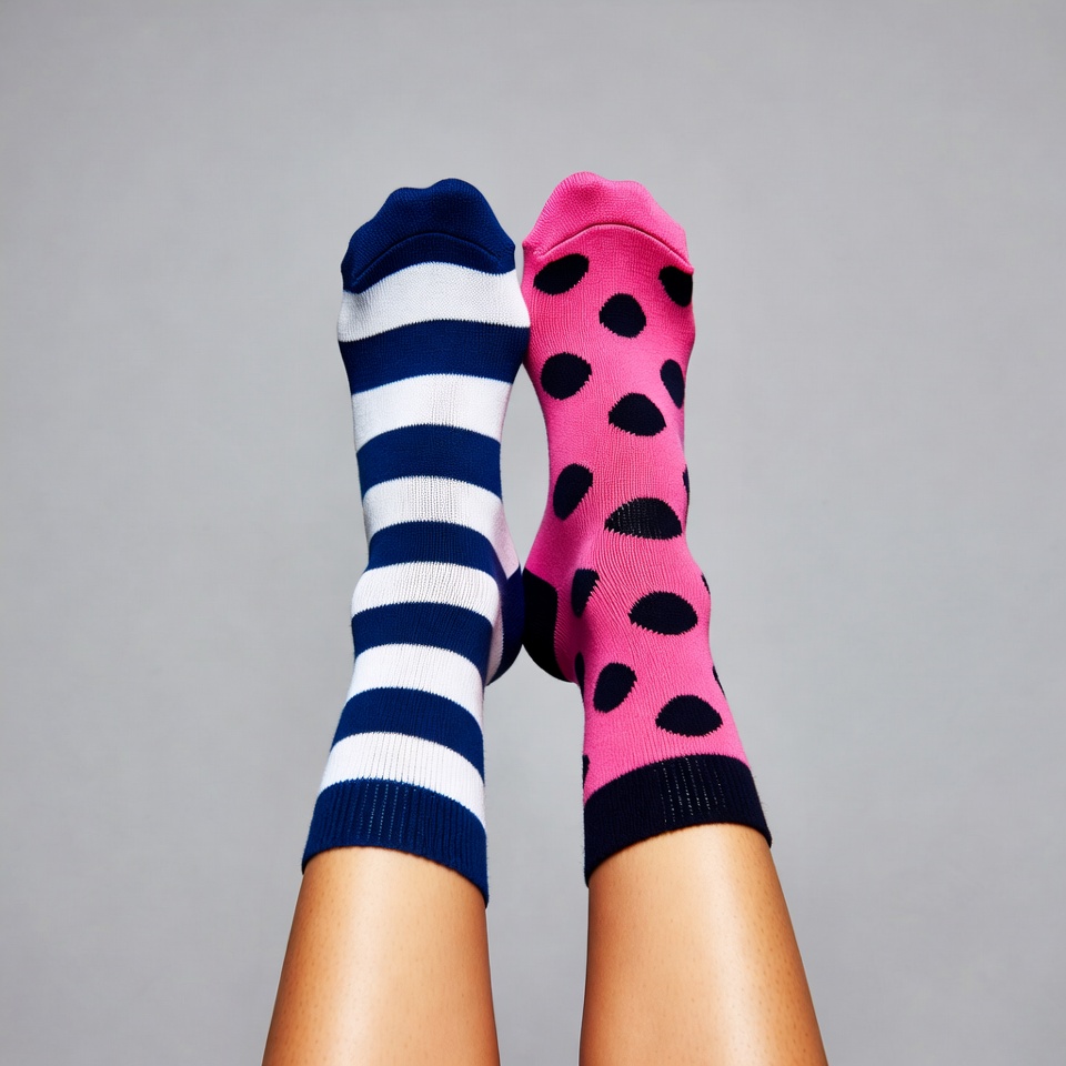 A pair of women's legs wearing colorful socks stands against a gray background. The left sock is navy blue with white stripes, and the right sock is bright pink with black polka dots. The socks are viewed from below, showcasing their patterns and cuffs.