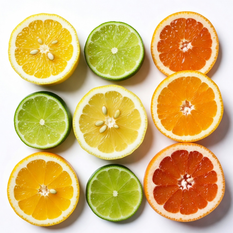 citrus, citrus fruit, cut fruit, fresh fruit, fruit grid, fruit slices, green lime, halved citrus, juicy segments, lemon, lime, lime slices, orange, orange fruit, orange slices, seeds, white background, yellow lemon, lemon slices